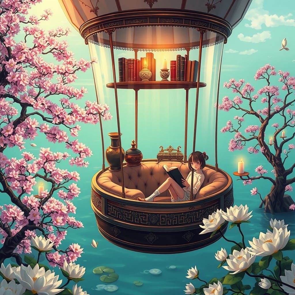 This image shows a crystal glass balloon floating above a serene lake, surrounded by vibrant sakura trees, bonsai trees, and white lotuses. Inside, a girl sits on a sofa, engrossed in a book, under warm candlelight, in a delicate anime art style reminiscent of Studio Trigger's signature aesthetic.