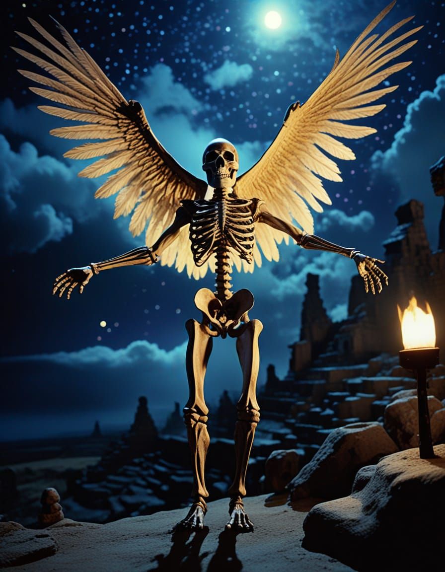 A cinematic still of a four-armed skeleton with feathered wings dancing in the sky, surrounded by the warm glow of a golden Mayan calendar and starry night sky, evoking the dark fantasy and surrealism of a 35mm film masterpiece.