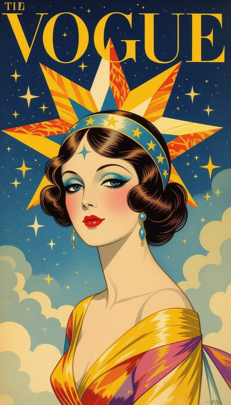 A vintage Vogue cover illustration of a fantastical star with a woman's face, painted in vibrant blues and yellows with detailed fashion elements. This art evokes early 20th-century magazine style.