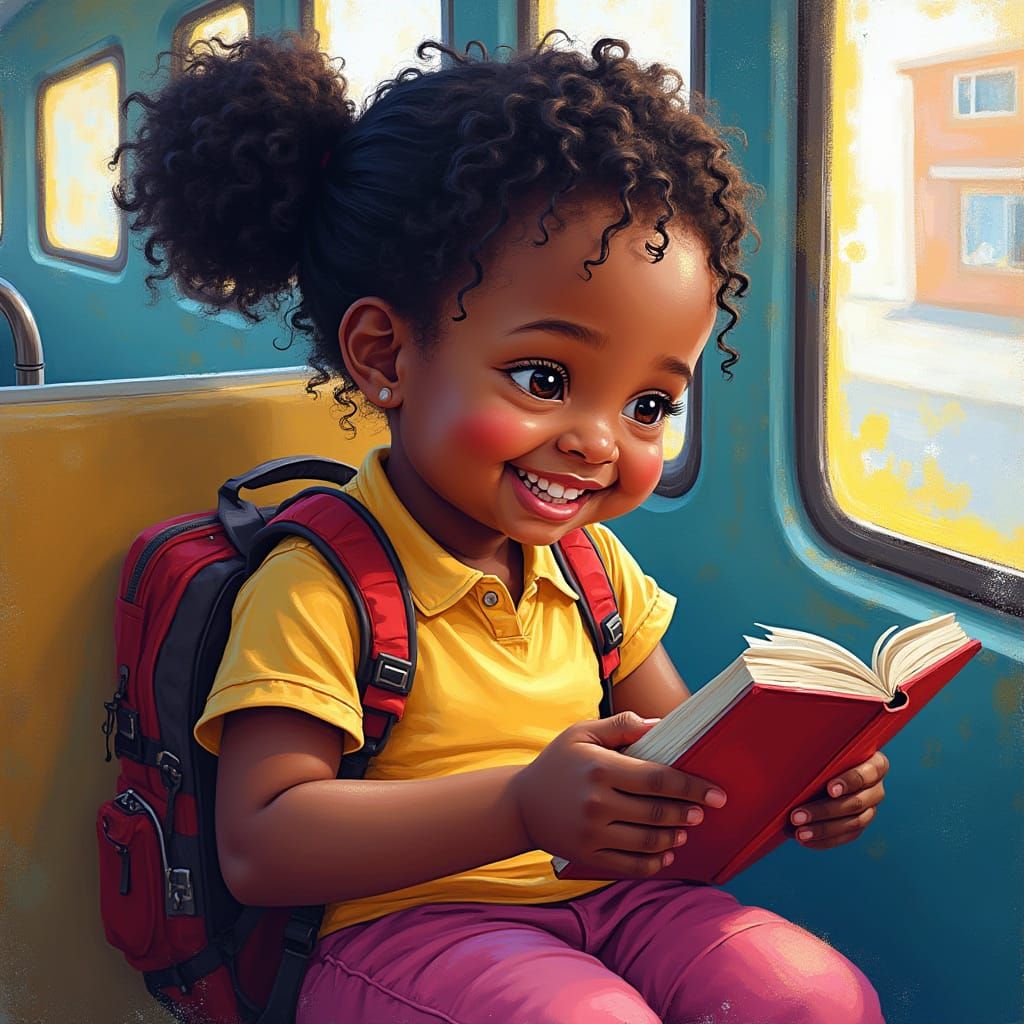 A beaming, round-faced Black girl reads school announcements on an afternoon ride. The image bursts with color in a graffiti and splash art style.
