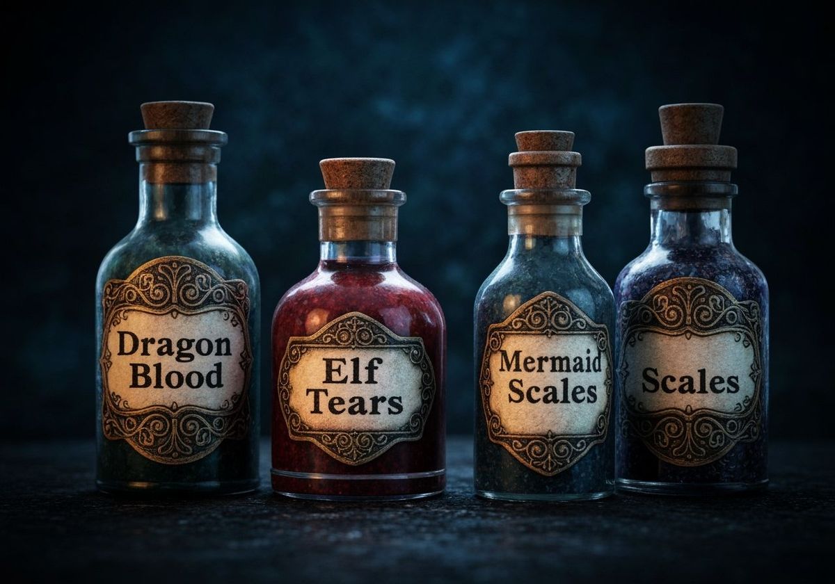 A striking picture of antique potion bottles with ornate labels. The bottles, filled with colorful liquids, are set against a dark, mystical backdrop in a gothic horror aesthetic.