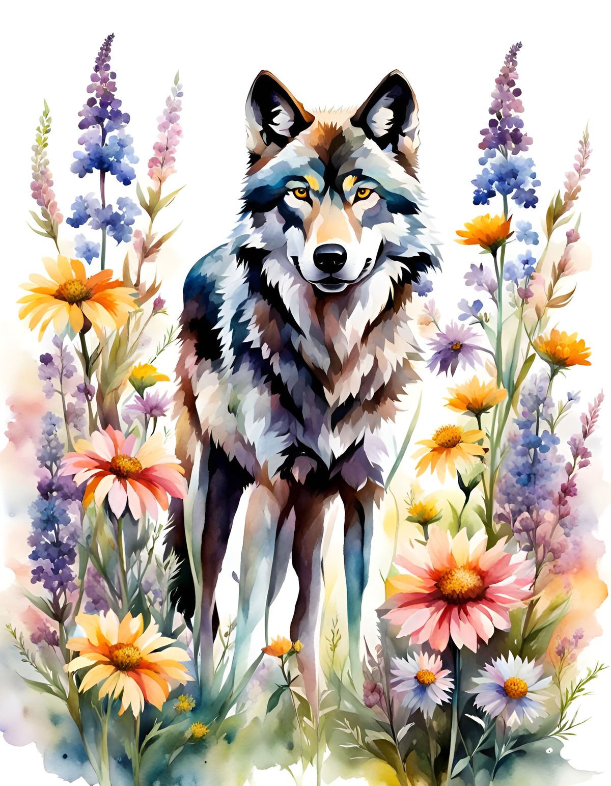 This image shows a full-body portrait of a highly detailed wolf standing amidst wildflowers, rendered in a soft pastel watercolor style with dynamic lighting.