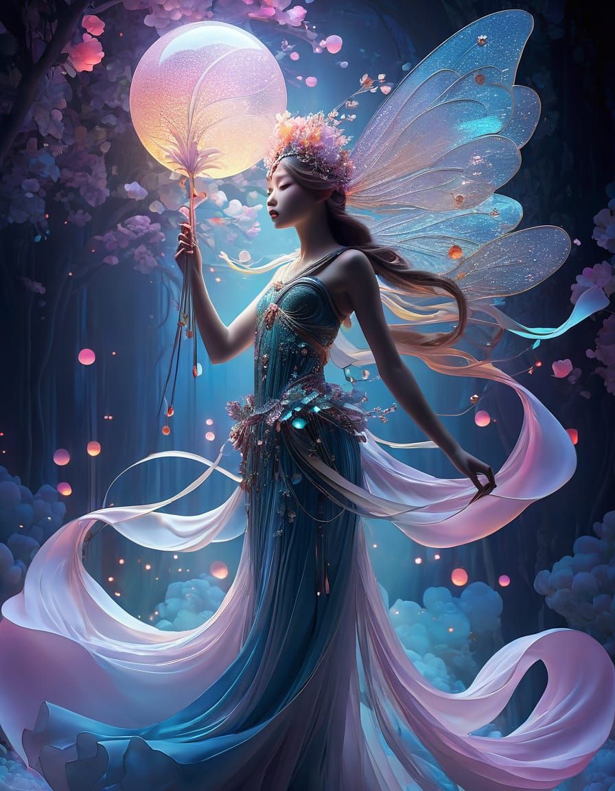 This image shows a luminescent, ethereal fantasy art piece. It features volumetric lighting, intricate detail, and sparkling effects, with a moody atmosphere and bokeh.