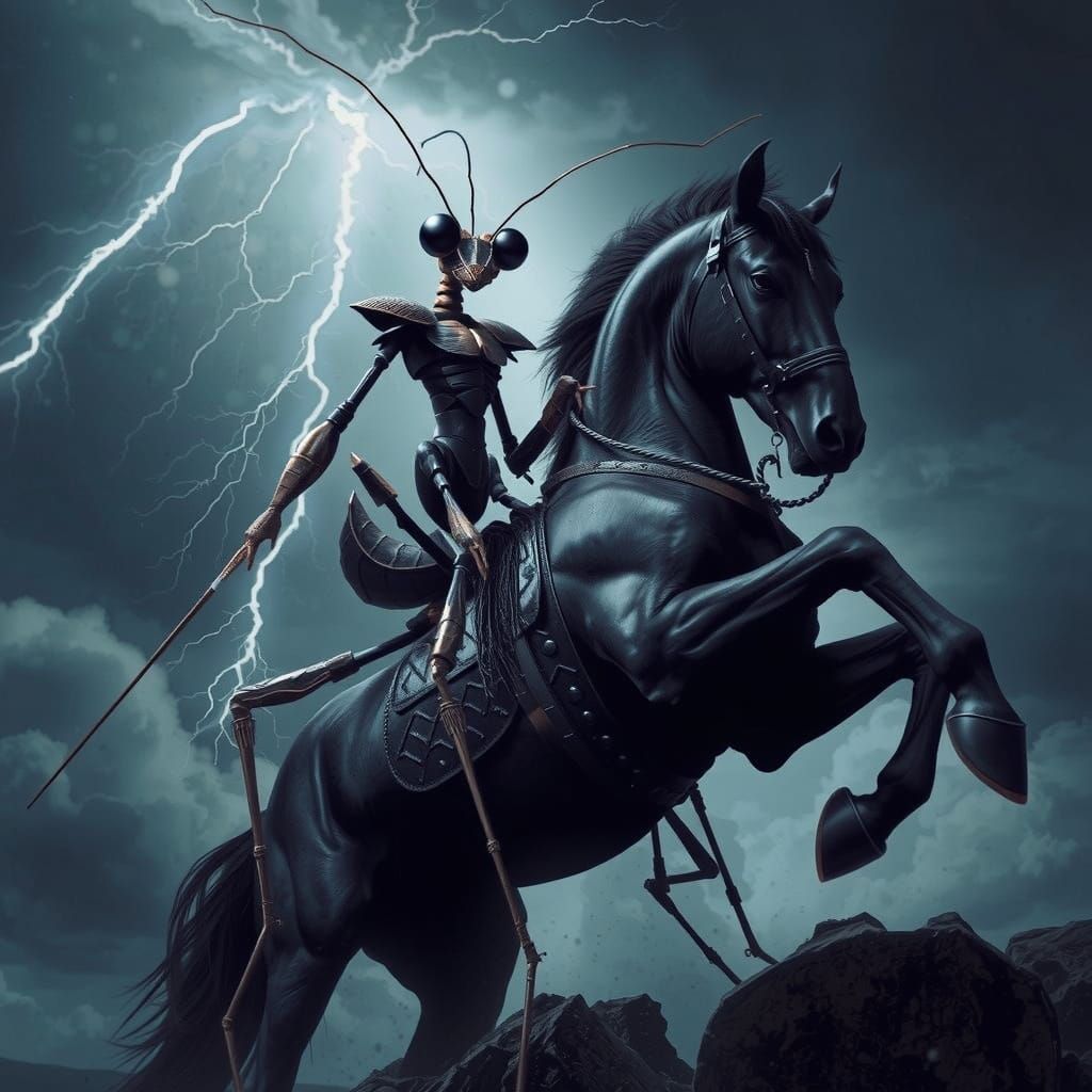 A Praying mantis mounted atop a muscular stallion, its insectoid limbs grip the reins as crackling lightning forks across the storm-ravaged sky, captured in a dramatic wide shot with high-contrast lighting that casts sharp silhouettes against the apocalyptic backdrop.