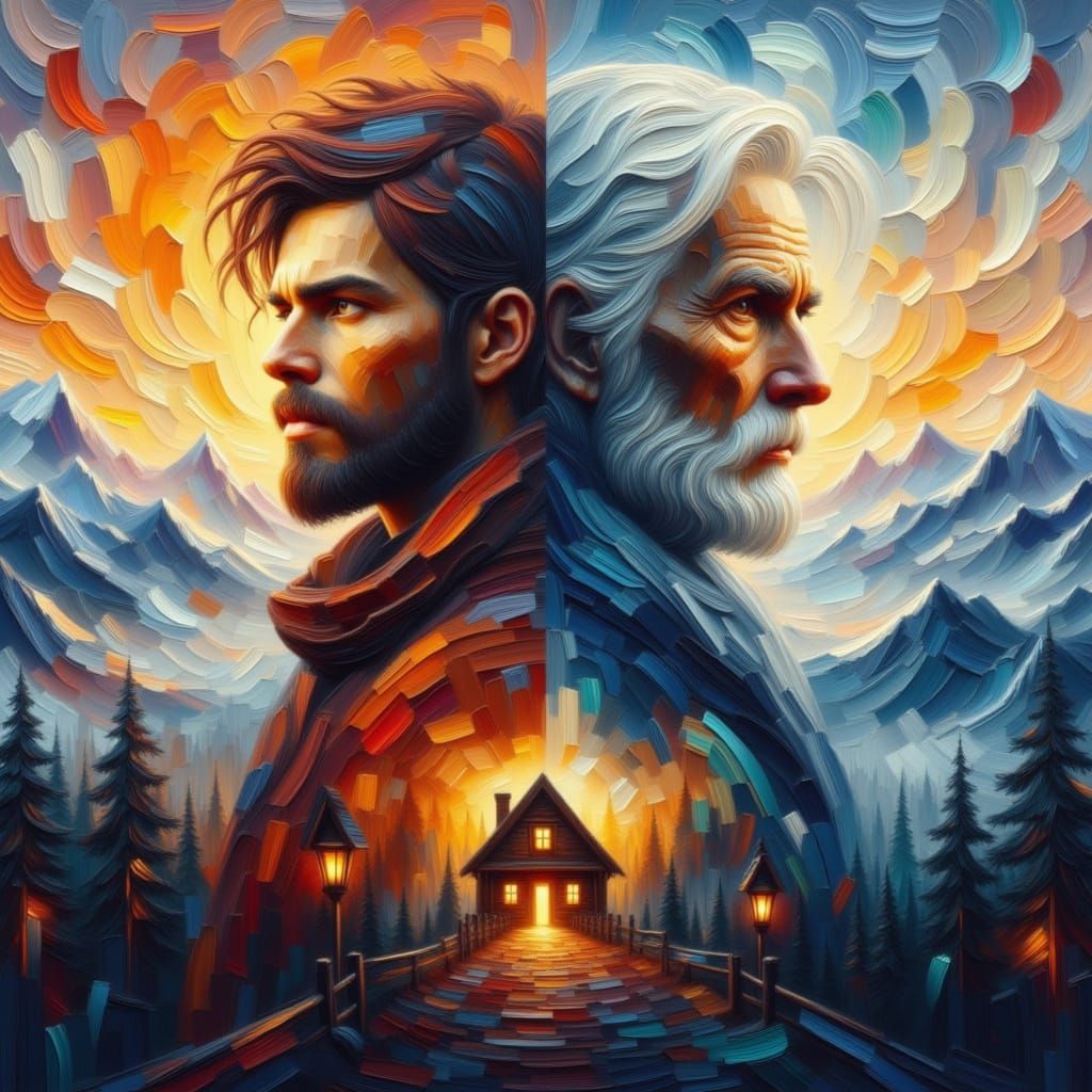 This impasto oil painting depicts the duality of a man from youth to old age, separated by a loyal dog. Rich textures and warm light capture determination and reflection.