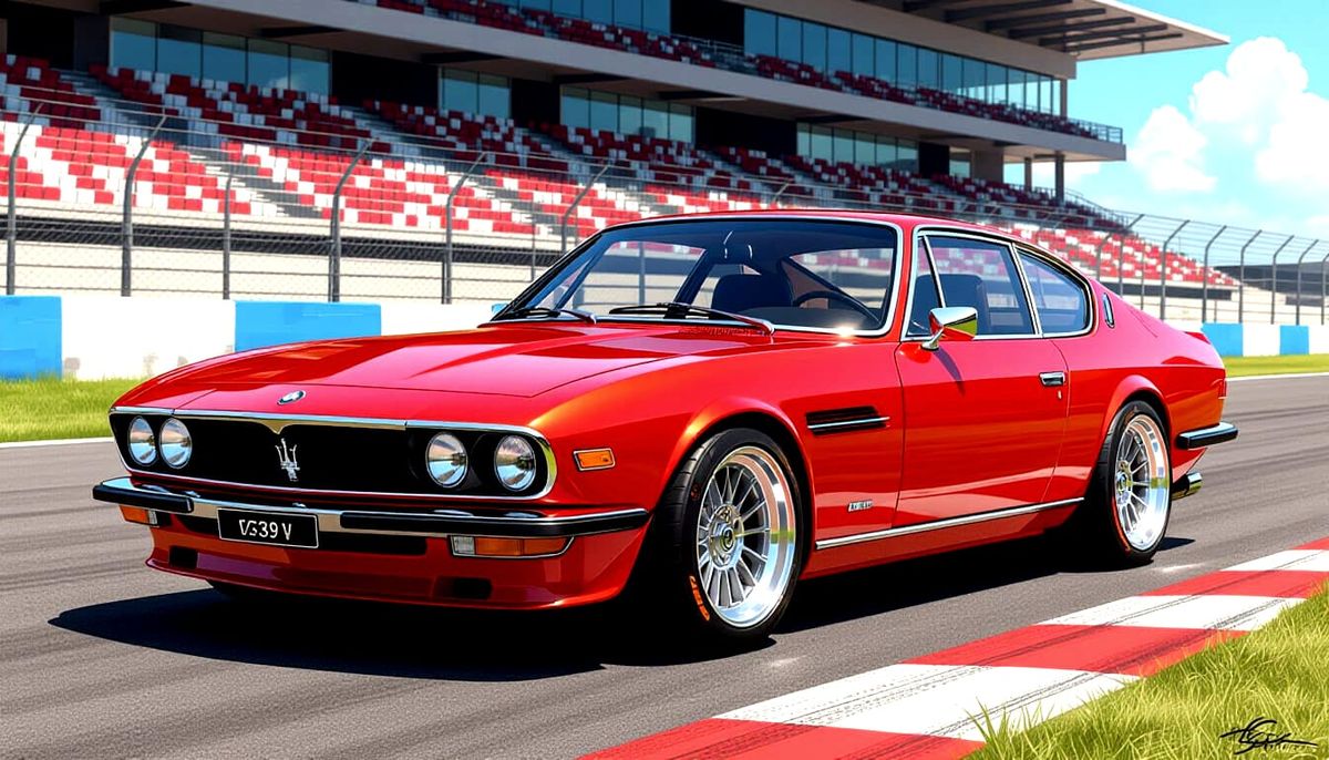 This hyperrealistic digital painting depicts a classic grand tourer coupe, blending 1970s Maserati and BMW designs in a striking Oro Longchamps red. Features sleek lines, motorsport wheels, and dramatic lighting in a race circuit paddock.