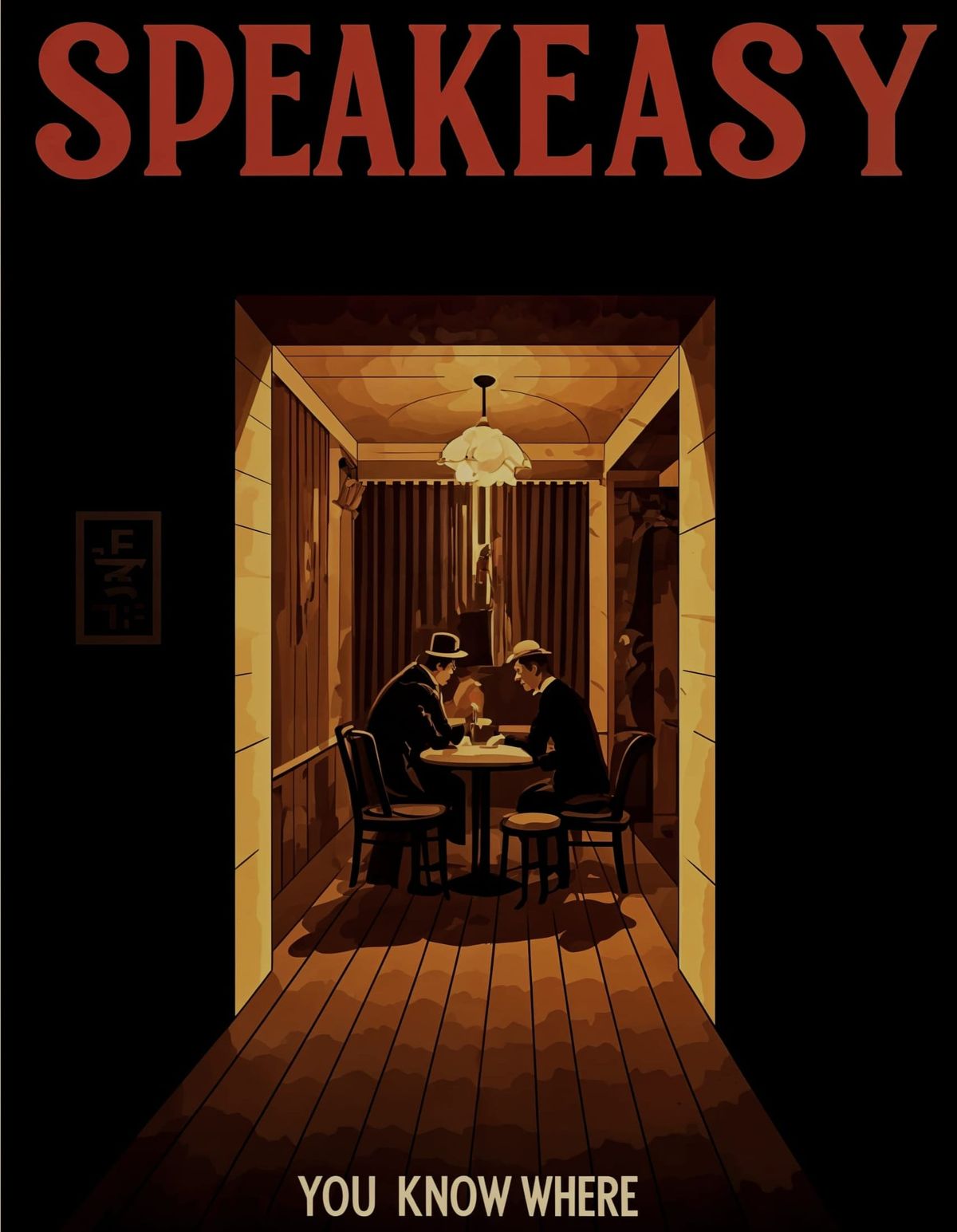 This image shows a vintage-style poster advertising a 1920s speakeasy. The poster depicts a small jazz club located in a basement, with the text "Speakeasy".