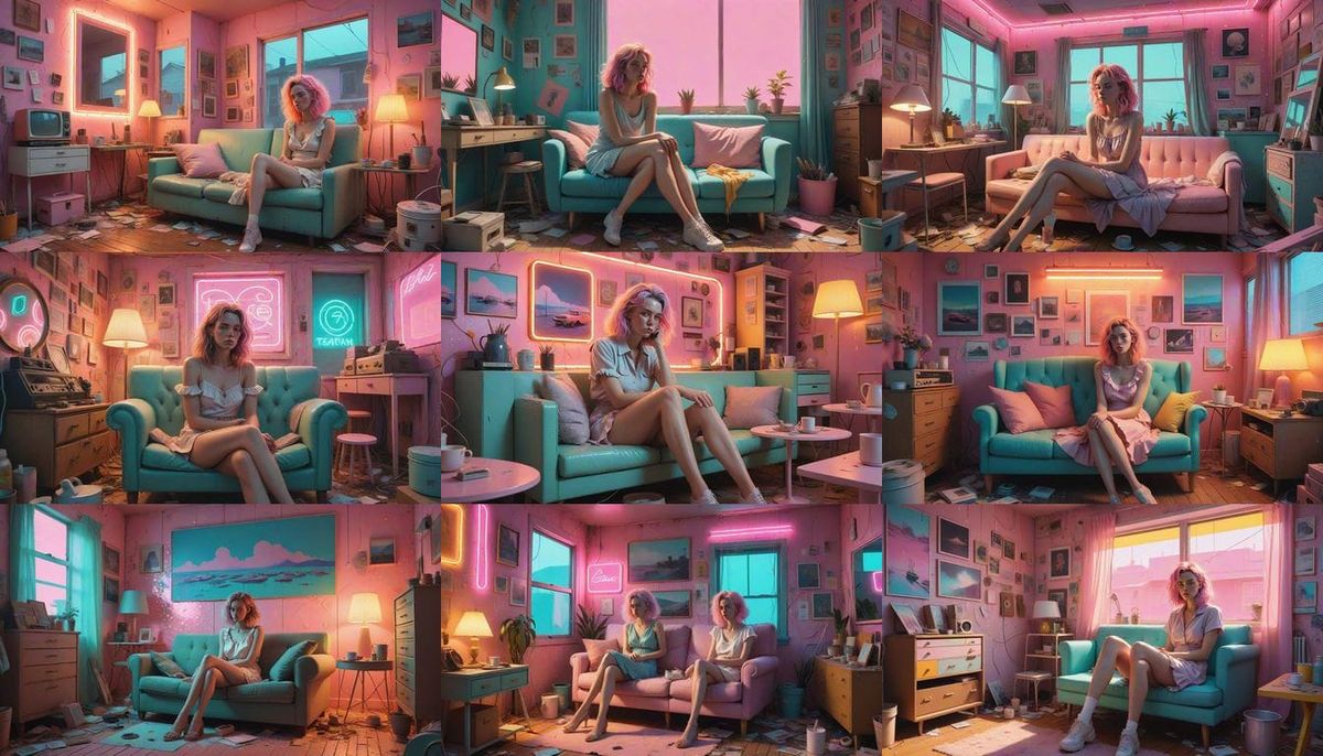 A 3D rendered scene of middle-aged women in a summer safehouse. The image features neon pastel hues, thrift store furniture, and a crayon-on-cardboard aesthetic, in a semi-abstract, cyber 3D style.