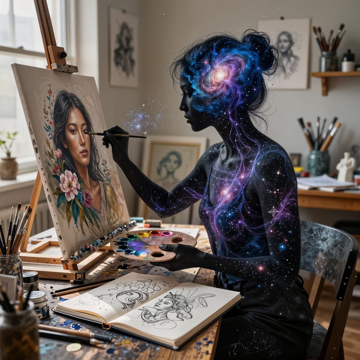 A striking double-exposure image shows a woman's silhouette filled with a vibrant nebula, painting an oil self-portrait with glowing cosmic elements and impasto brushstrokes.