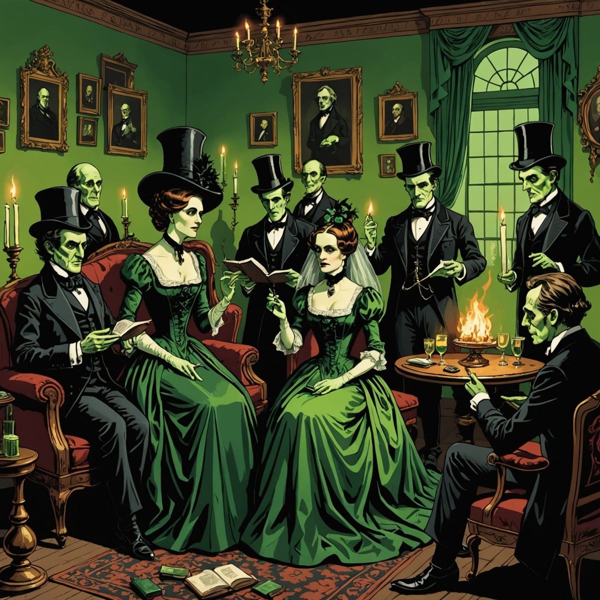 This image shows a haunted Victorian salon with a strange author reading to an audience. The scene features baroque elements, ghostly figures, and literary debauchery in a gothic aesthetic.