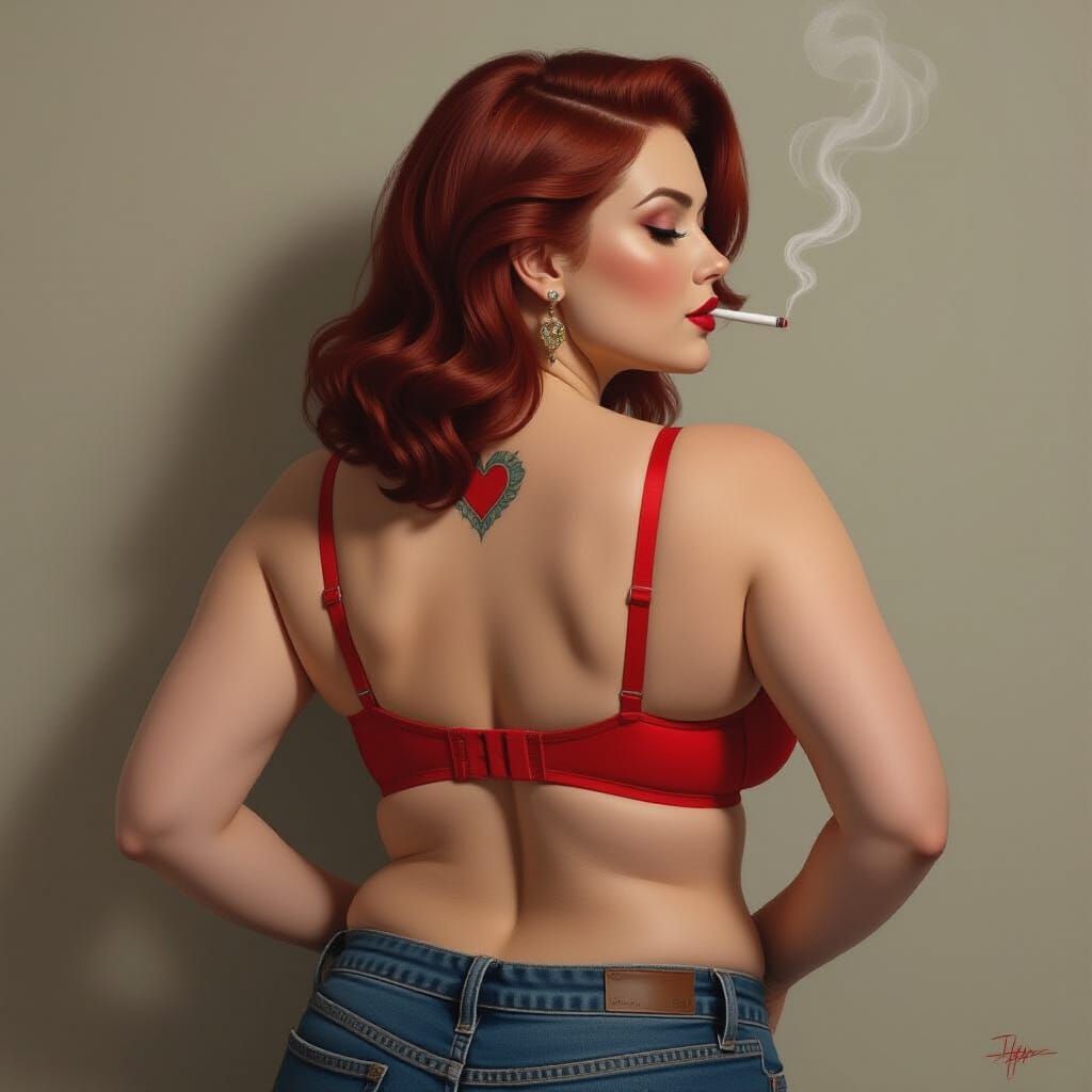 A full-length image of a plus-sized woman with pale skin and red-brown hair, wearing a red bra and jeans. Hyperrealistic rendering captures a heart tattoo on her back.