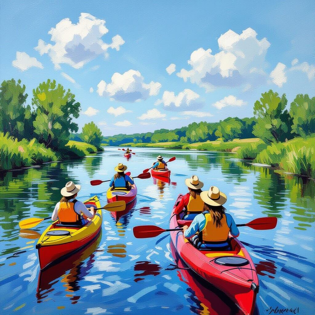 A scenic view of six women kayaking up a wide river. The red and yellow kayaks contrast with the lush greenery and blue sky in an impressionistic style.