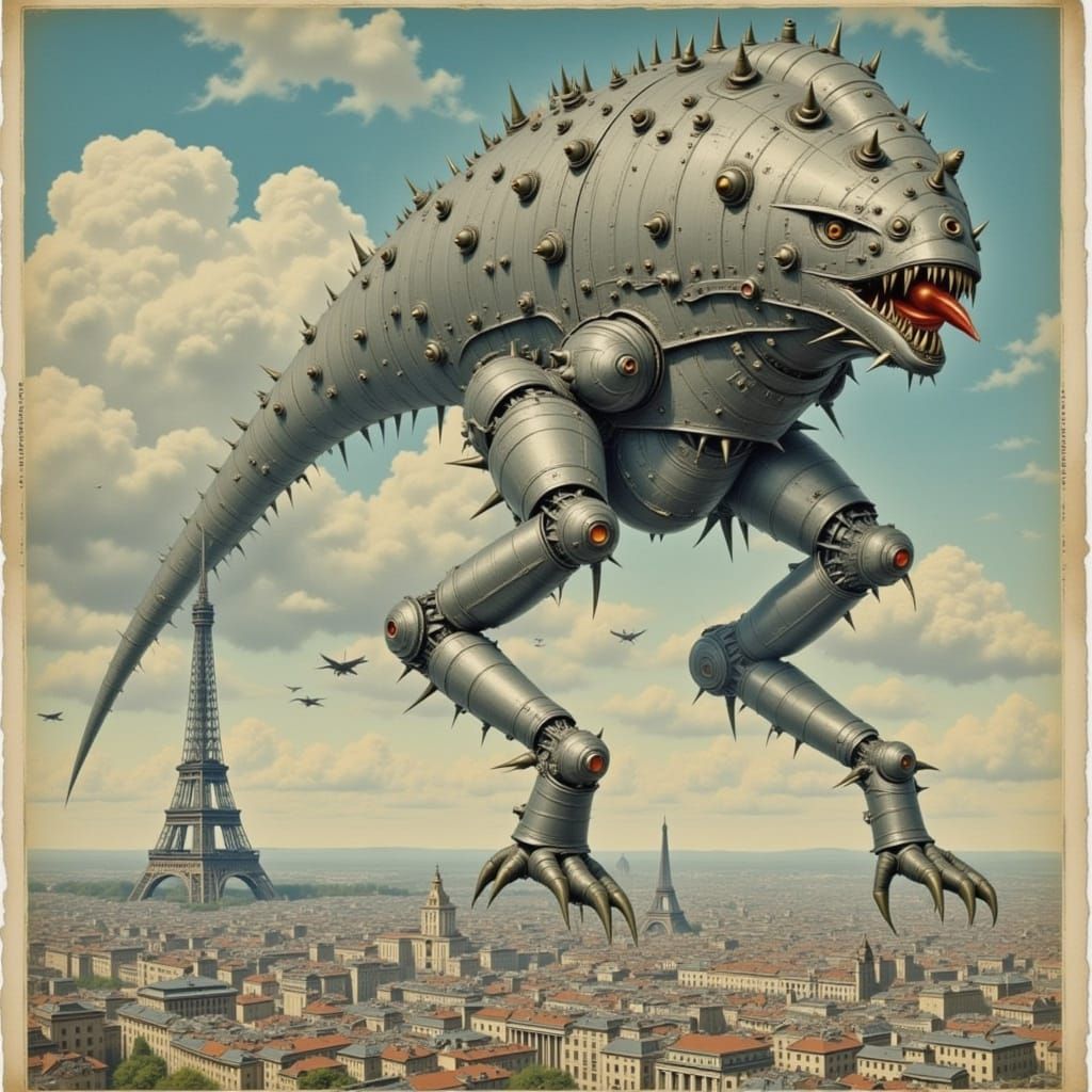 This image depicts a vintage French postcard scene featuring a metallic monster hovering in the Parisian sky, set against a backdrop of clouds.