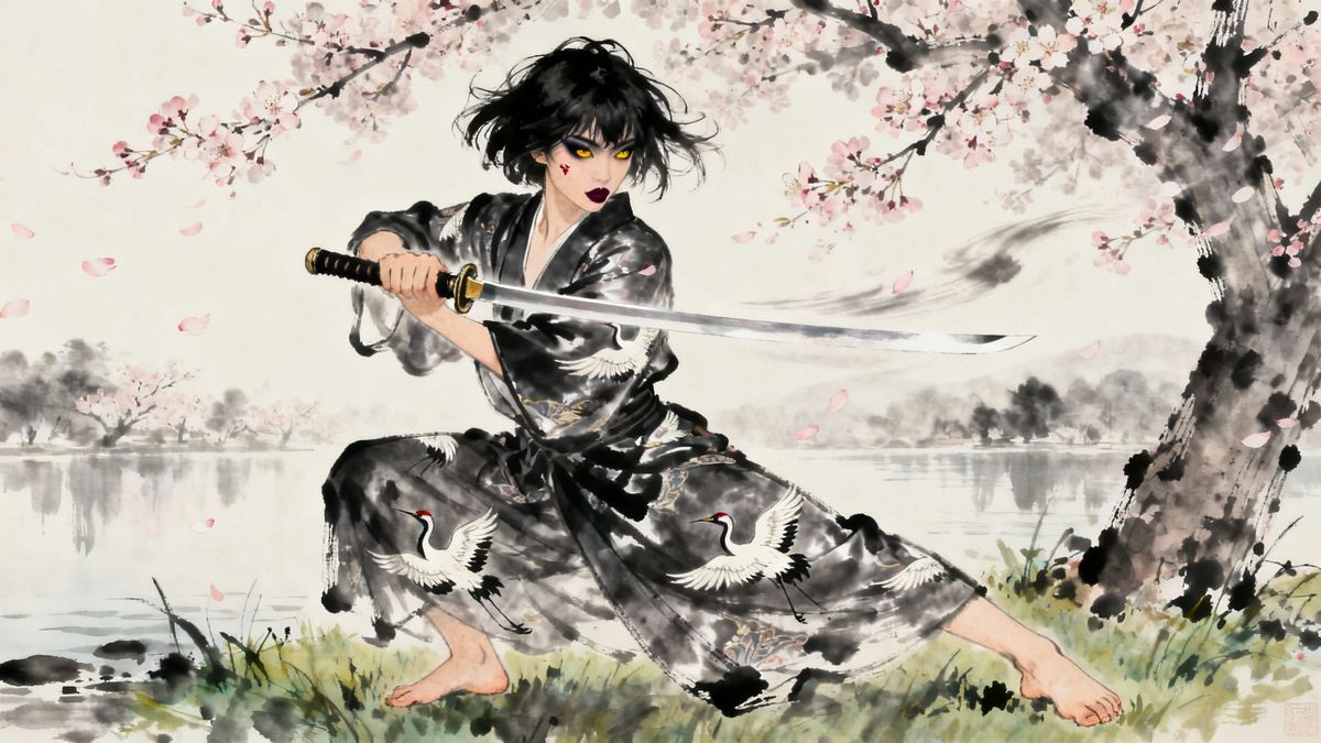 This image shows a young Asian warrior woman in a crane-decorated silk kimono practicing katana forms by a lake under a cherry blossom tree. Her intense expression and striking features convey mystery and allure.