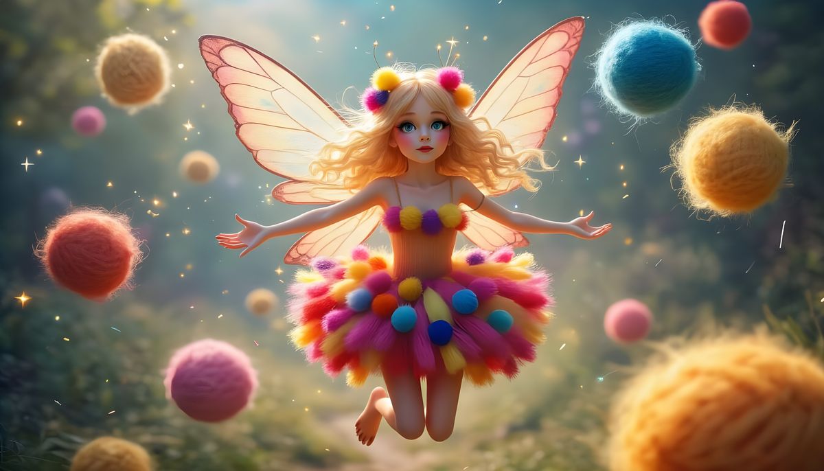 This image shows a blonde fairy in a pom-pom dress. The magical fairy is flying near wool balls, surrounded by magical effects.