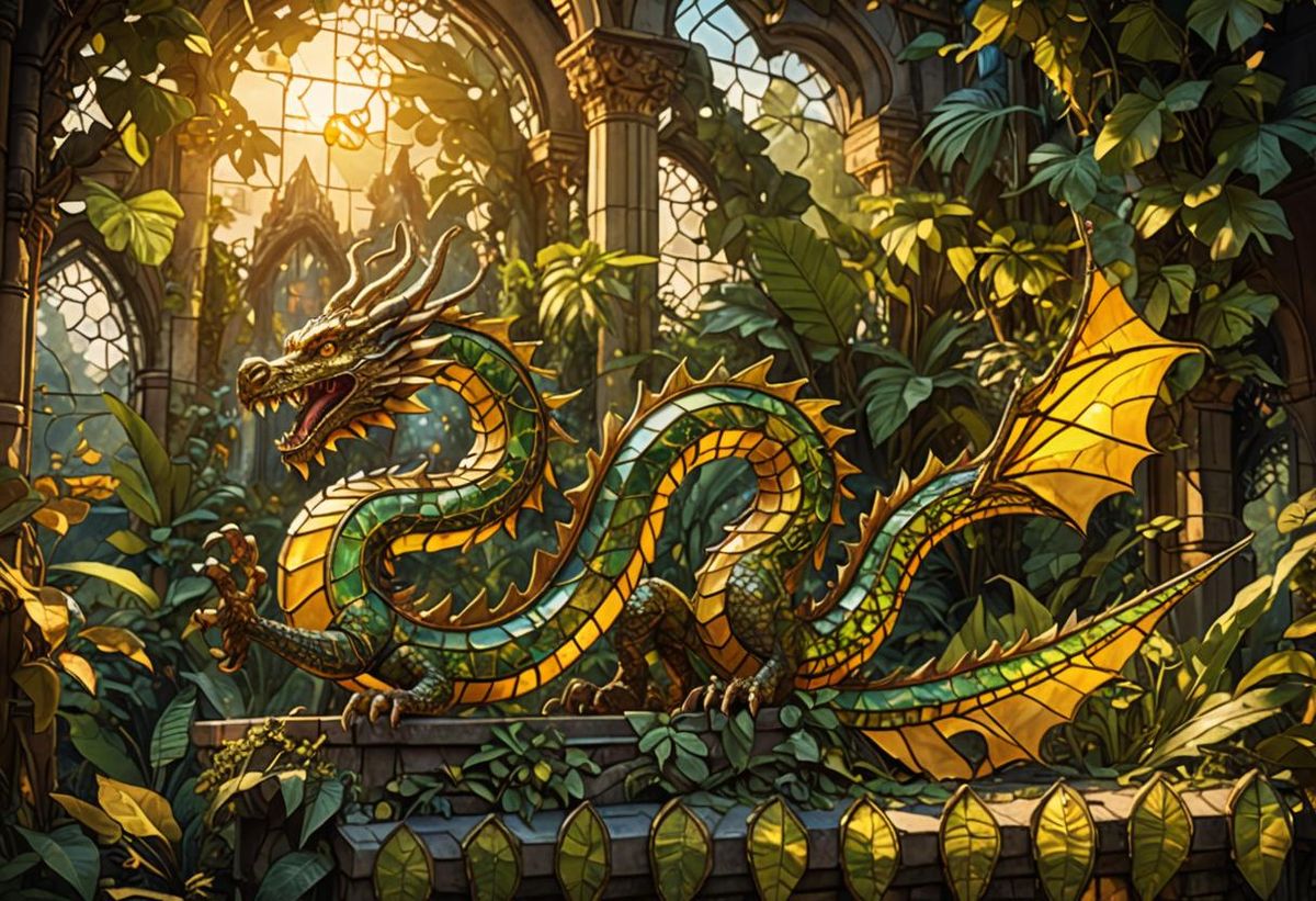 A medium shot of a stained glass dragon perched atop a ruined jungle temple. Golden light illuminates the dragon and the surrounding foliage in this detailed fantasy art.