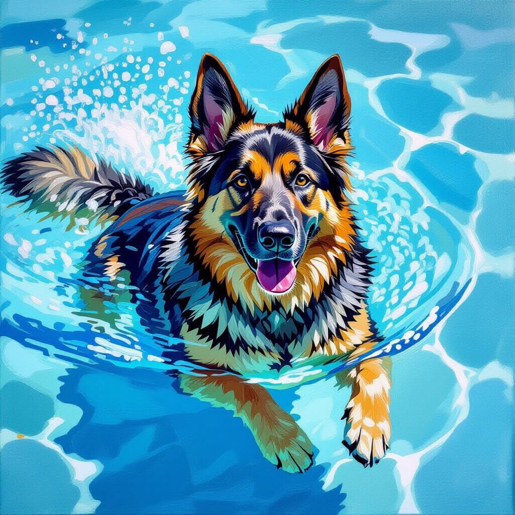 This image is a realistic oil painting of a cute German Shepherd swimming in a vibrant blue pool. It features textured brushstrokes and dramatic lighting, capturing wet fur and water droplets with rich depth.