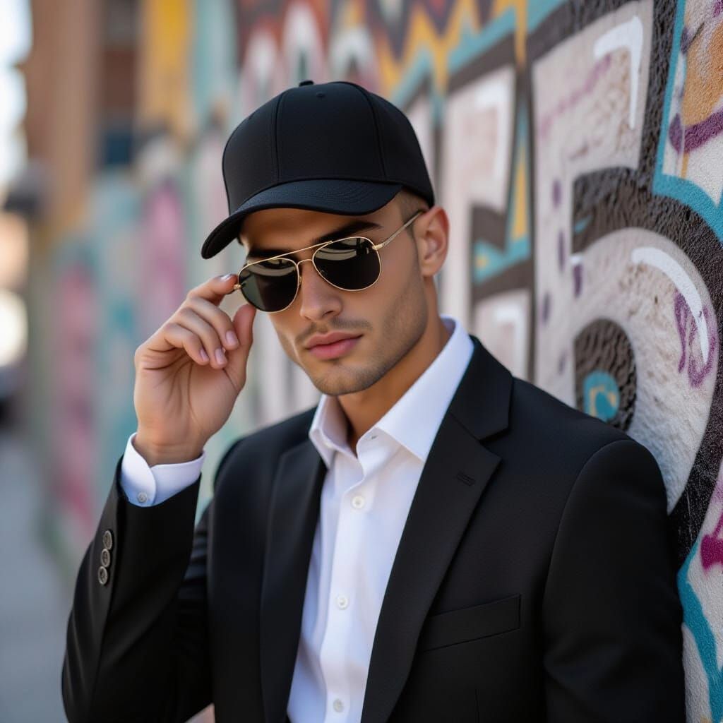 This image shows a handsome young man in a suit removing his sunglasses. He is wearing a skullcap and standing next to a wall covered in colorful graffiti.