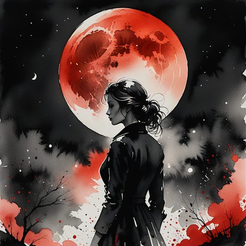 This image shows a striking black and white silhouette of a woman set against a vibrant red moon in a beautiful watercolor ink wash style with subtle splash effects.