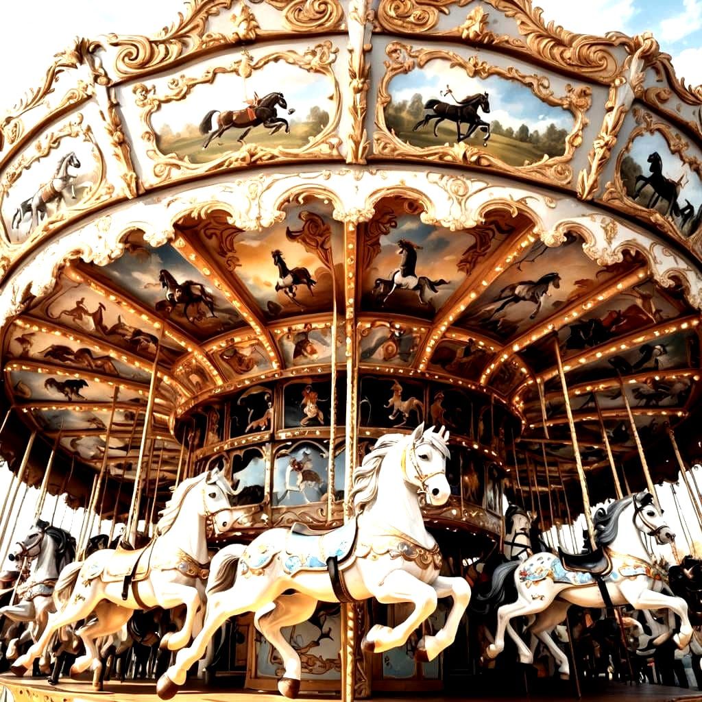 This image shows a carousel with horses in various shades of grey, black, white, and brown. The carousel's canopy features painted pictures, creating a mesmerizing scene.