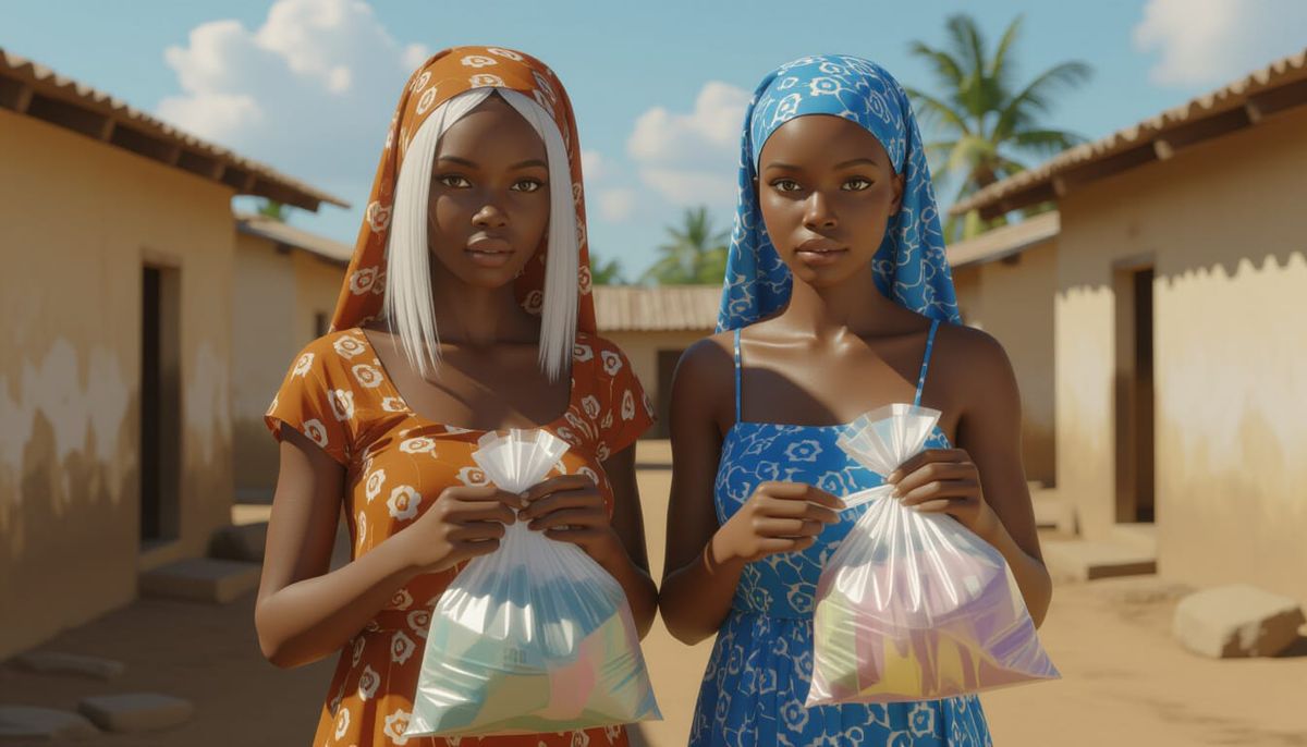This image shows two young African women, barefoot and holding their belongings, standing in a stark orphanage setting. Rendered in a hyperrealistic animated style with dramatic lighting.