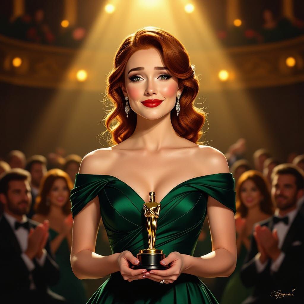 This image depicts a woman with auburn hair in an emerald gown receiving an award in a grand auditorium. Rendered in the style of Dutch Masters, it features rich colors and dramatic chiaroscuro lighting, capturing emotional intensity and joy.