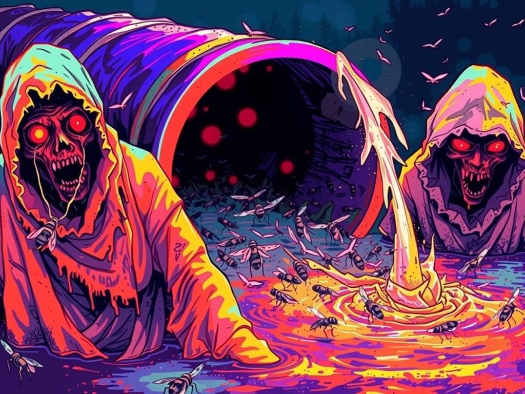 A grim, gothic industrial image depicting a bursting pipe spewing sewerage onto wretched, mutated lepers with glowing red eyes, rendered in a gritty, raw style with swarms of flies.
