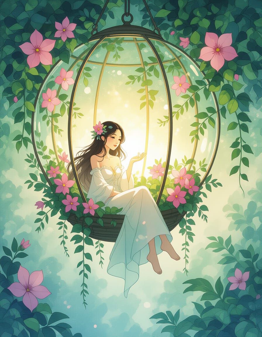 A whimsical woman is depicted within a glass balloon, surrounded by a lush fantasy landscape. The scene is rendered as a dreamy watercolor sketch with soft brushstrokes and ethereal lighting.