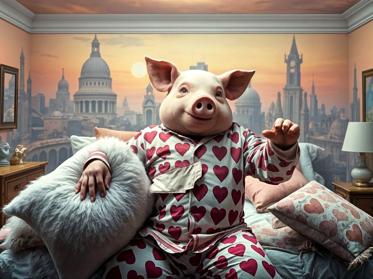This image shows a surreal scene of a portly man with a pig's head engaged in a pillow fight. The digital matte painting is intricately detailed, with a dramatic and whimsical atmosphere.