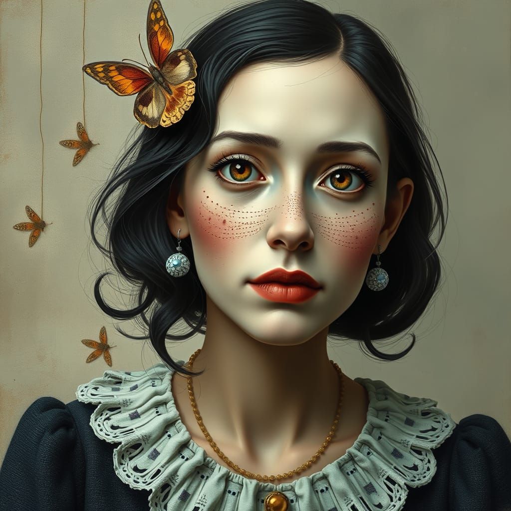 A captivating digital portrait of a whimsical woman, featuring intricate details and dynamic lighting in a colorful, vibrant style reminiscent of surrealist and fantasy art
