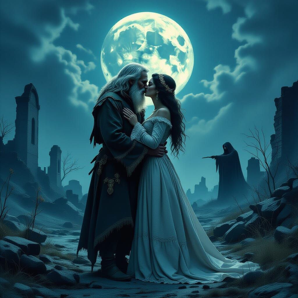 This image shows an elderly man and a woman embracing under moonlight in a ruined landscape. The scene evokes dark romanticism with gothic undertones and a hint of horror, and the distant figure of death.