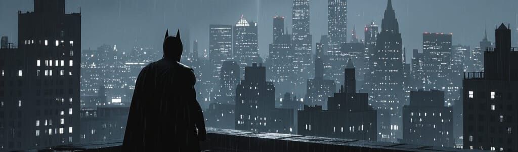A cinematic, high-contrast image of Batman silhouetted on a rainy Gotham rooftop. The Bat-Signal pierces a gloomy sky, evoking a gritty noir atmosphere with dramatic lighting on wet surfaces.