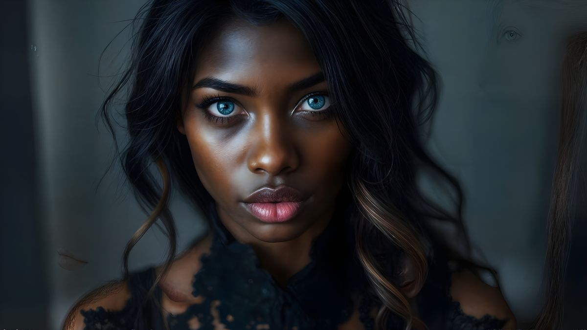 A hyperrealistic full-body picture of a beautiful light-skinned African-American woman. She has silky black hair with brown strands, crystal blue eyes, freckles, and full pink lips. She wears a black lace corset.
