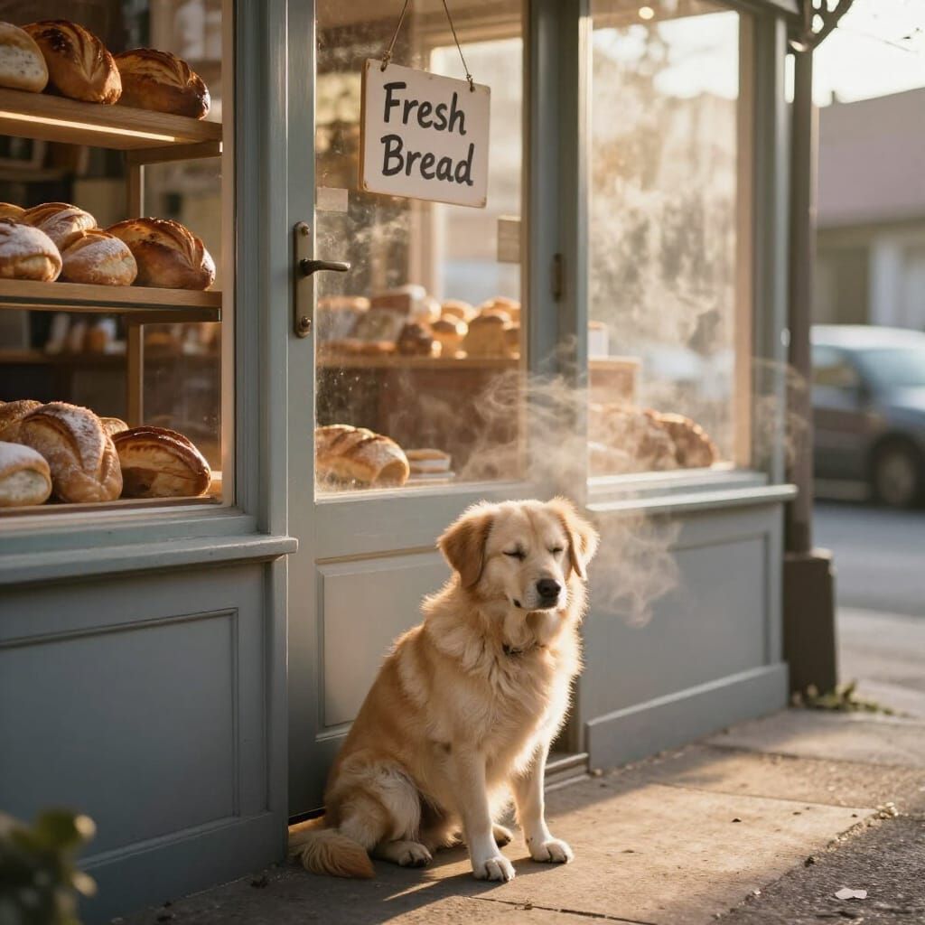 This image shows a peaceful scene of a dog waiting outside a bakery at dawn. Soft light and warm colors create a cozy, comforting atmosphere with high detail.