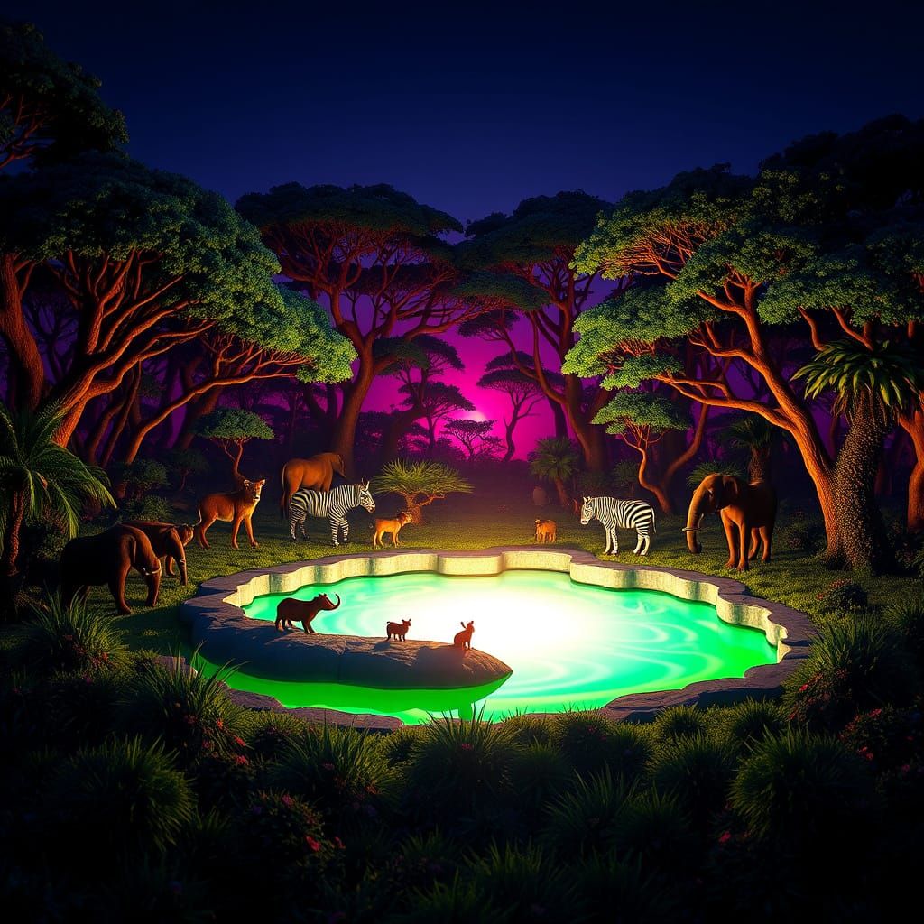 This image shows African wildlife congregating at a luminous watering hole set within a dense, colorful forest. The scene is rendered as 3D digital art with a vibrant palette and cinematic lighting.