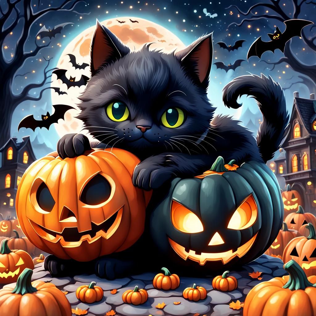 This image shows an adorable chibi-style black cat curled around a jack-o'-lantern, surrounded by bats. This 3D rendering uses a hyperdetailed, ethereal fantasy style.