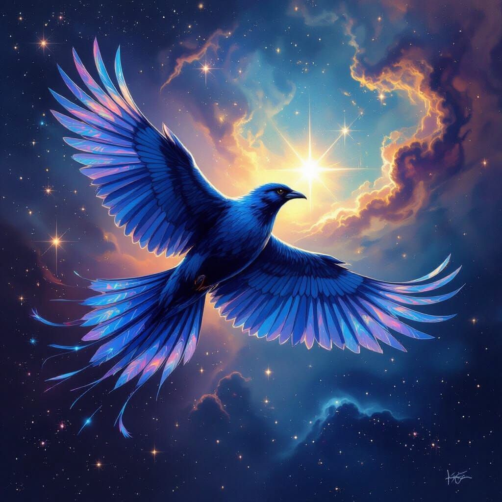 This image depicts a surreal bird with shimmering blue and purple feathers in flight amidst a vibrant cosmic nebula and star clusters. The art style is dreamlike and painterly, with dramatic backlighting.
