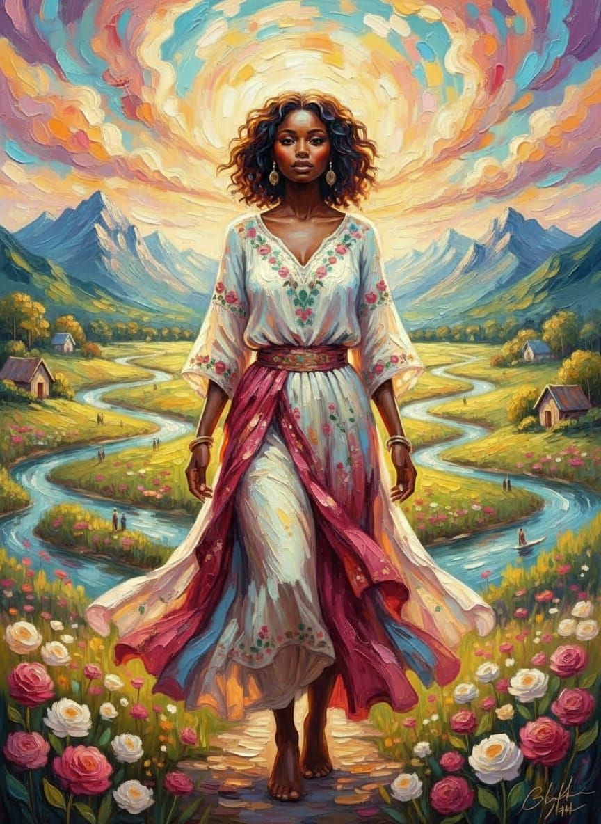 This image showcases a Zimbabwean woman bathed in light, with a dreamy landscape featuring rivers, mountains, and cottages leading to the sea. Rendered in an impasto style with a vibrant color palette.