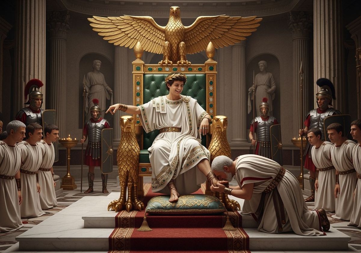This image shows Emperor Nero seated on a golden throne, receiving homage from kneeling senators. Roman legionnaires stand guard as the emperor gestures, his expression conveying amusement at the senator's display of fealty.