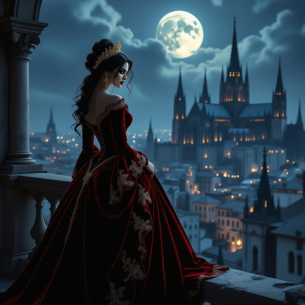 A striking picture of a Spanish singer on a moonlit balcony. She wears a blood-red velvet gown, overlooking a desolate, gothic cityscape. The image is a hyper-realistic digital painting.