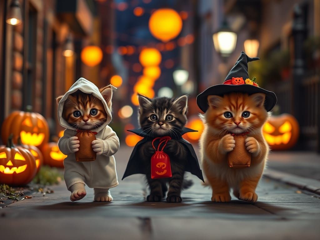 This photorealistic image captures three cute kittens in Halloween costumes trick-or-treating at night. Illuminated by jack-o'-lanterns, they wear ghost, vampire, and witch outfits, holding candy bags on a charming street.
