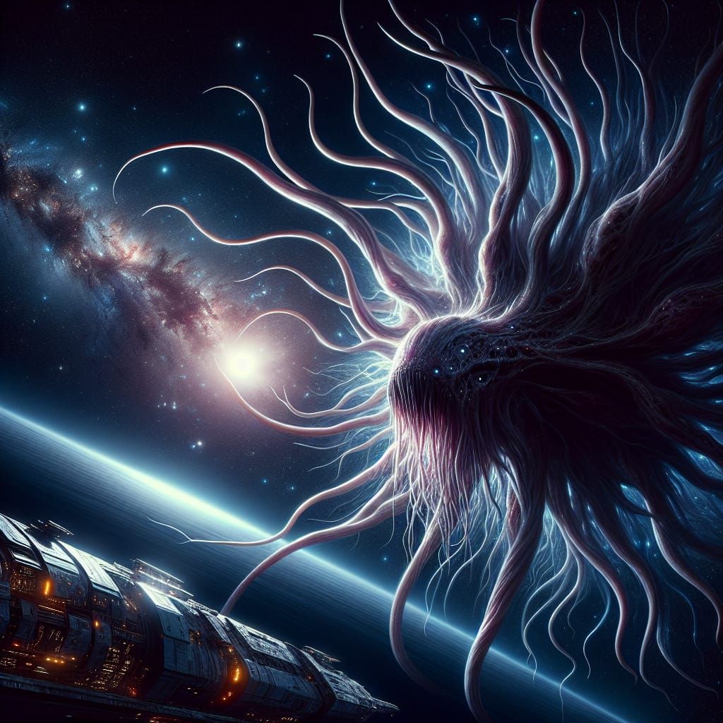 A terrifying cosmic entity with tentacle-like appendages engulfs a spaceship in deep space. This image evokes a sense of Lovecraftian horror and the fear of the unknown in a dark, unsettling scene.