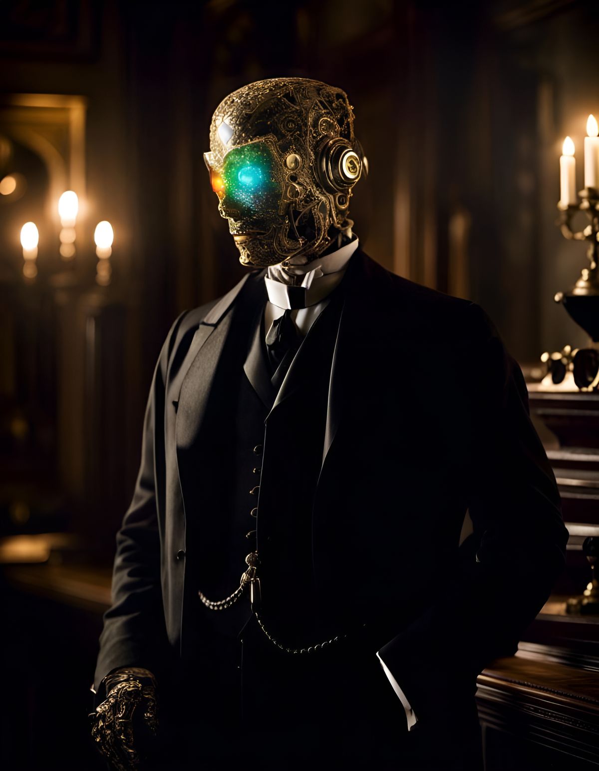 shining iridescent rainbow intricate hyperdetailed Victorian robot butler, Victorian mansion, professional photography, intricate hyperdetailed Victorian gold lace, hyperrealistic professional photography, ominous lighting, well-lit faces, sharp focus