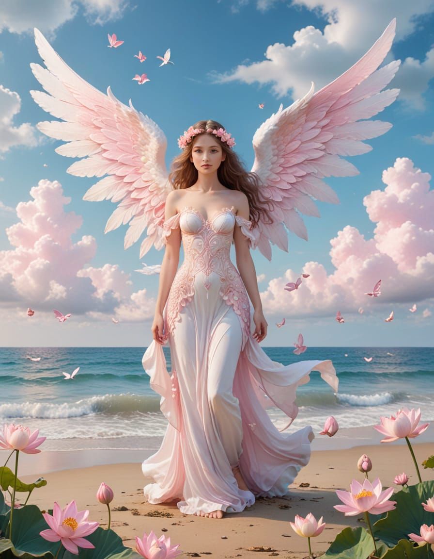 beautiful angel with wings made of clouds stands on the seashore, dressed in white and pink decorated with flowers. The sky is painted in pastel colors, and there is an ocean behind her. There are lotus blossoms around, and everything looks like it comes from a fairy tale world.
