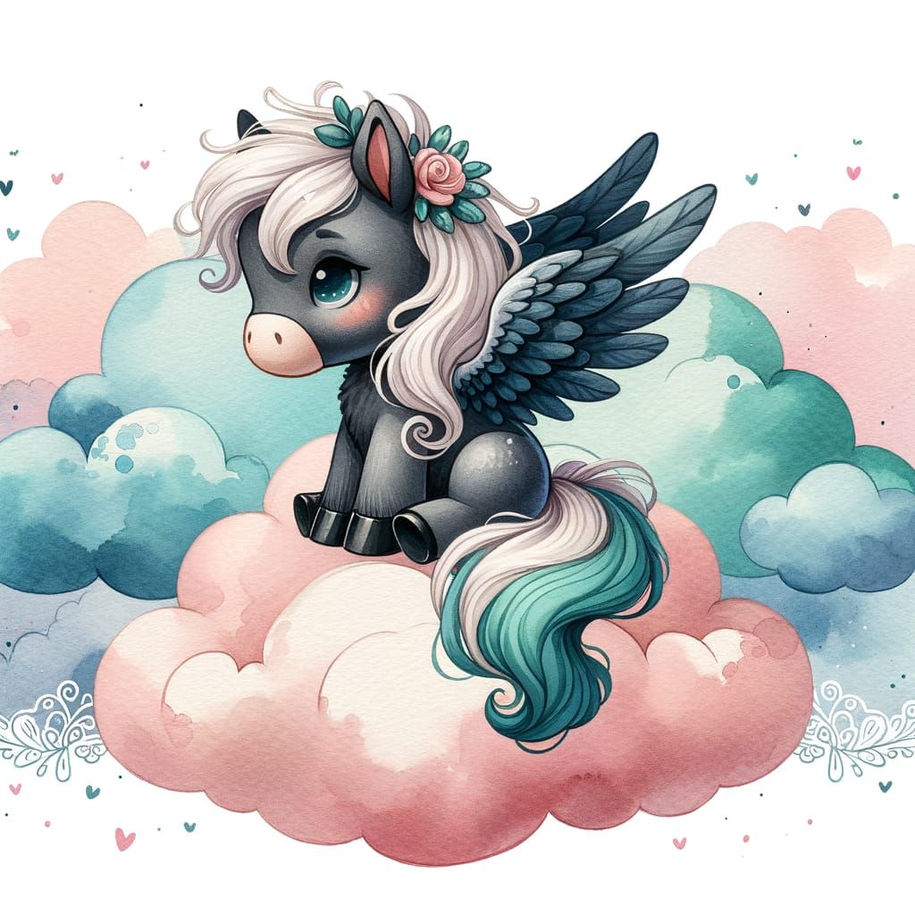 This image shows a cute chibi-style, black-winged horse with white mane and tail, sitting on a pastel cloud. The watercolor cartoon art features delicate filigree and heart shapes.