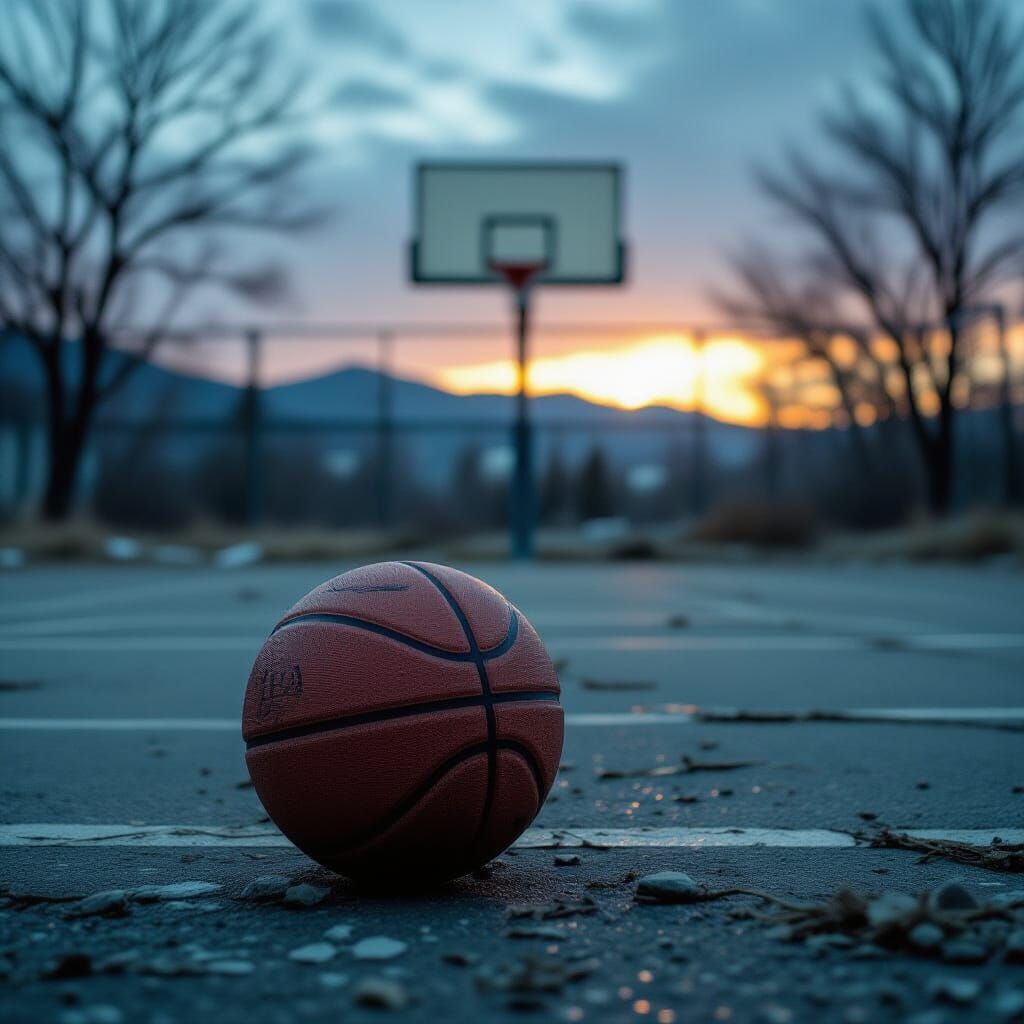 This image shows an abandoned basketball sitting on a desolate court in a post-apocalyptic world. The scene features cinematic lighting, intense film grain, and a dramatic color grade, reminiscent of epic film.