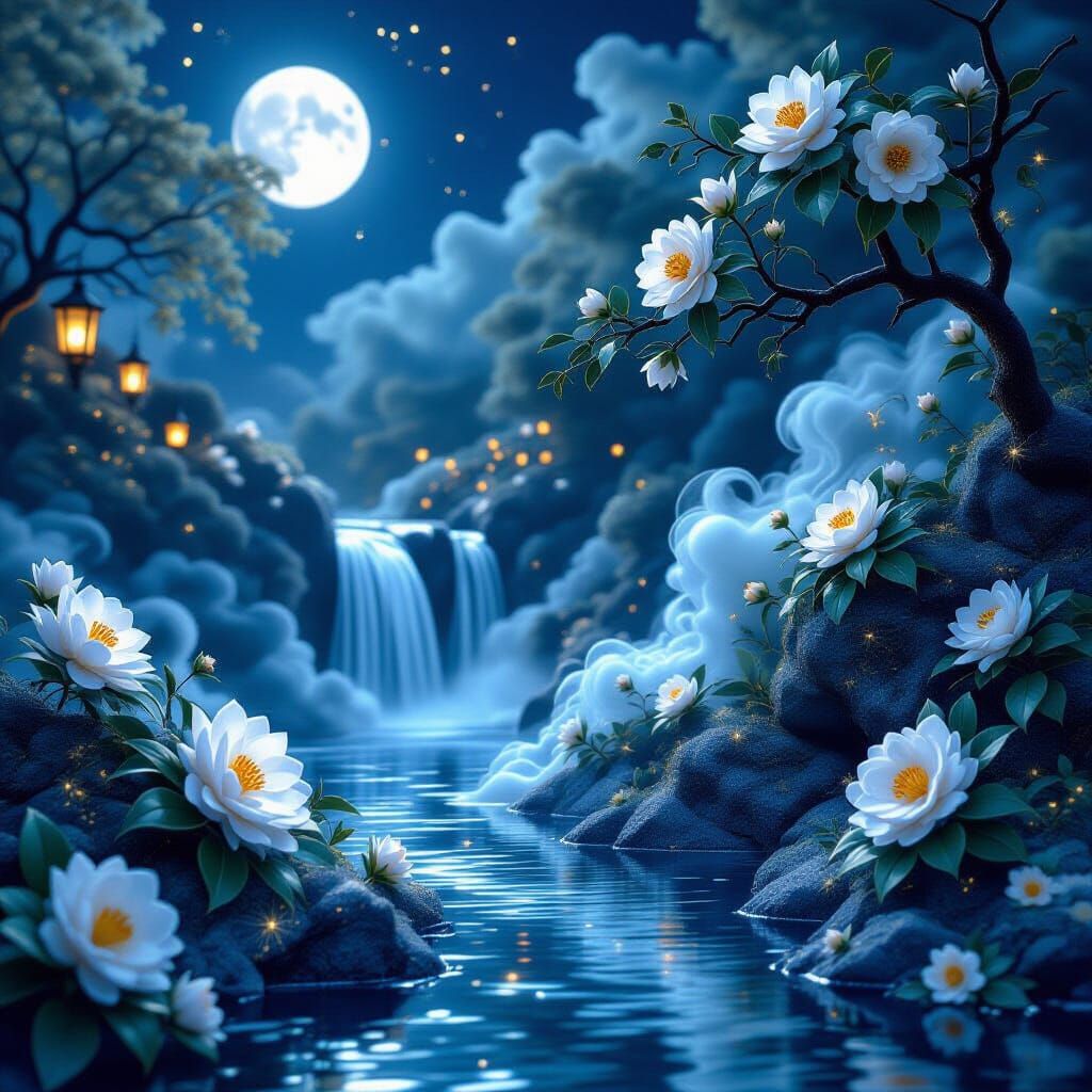 A close-up macro view reveals an ethereal 3D microworld of smoke fractals on frosted glass. Features a moonlit waterfall and camellia trees, with golden glitter and dynamic double exposure, in a surreal fantasy cartoon style.