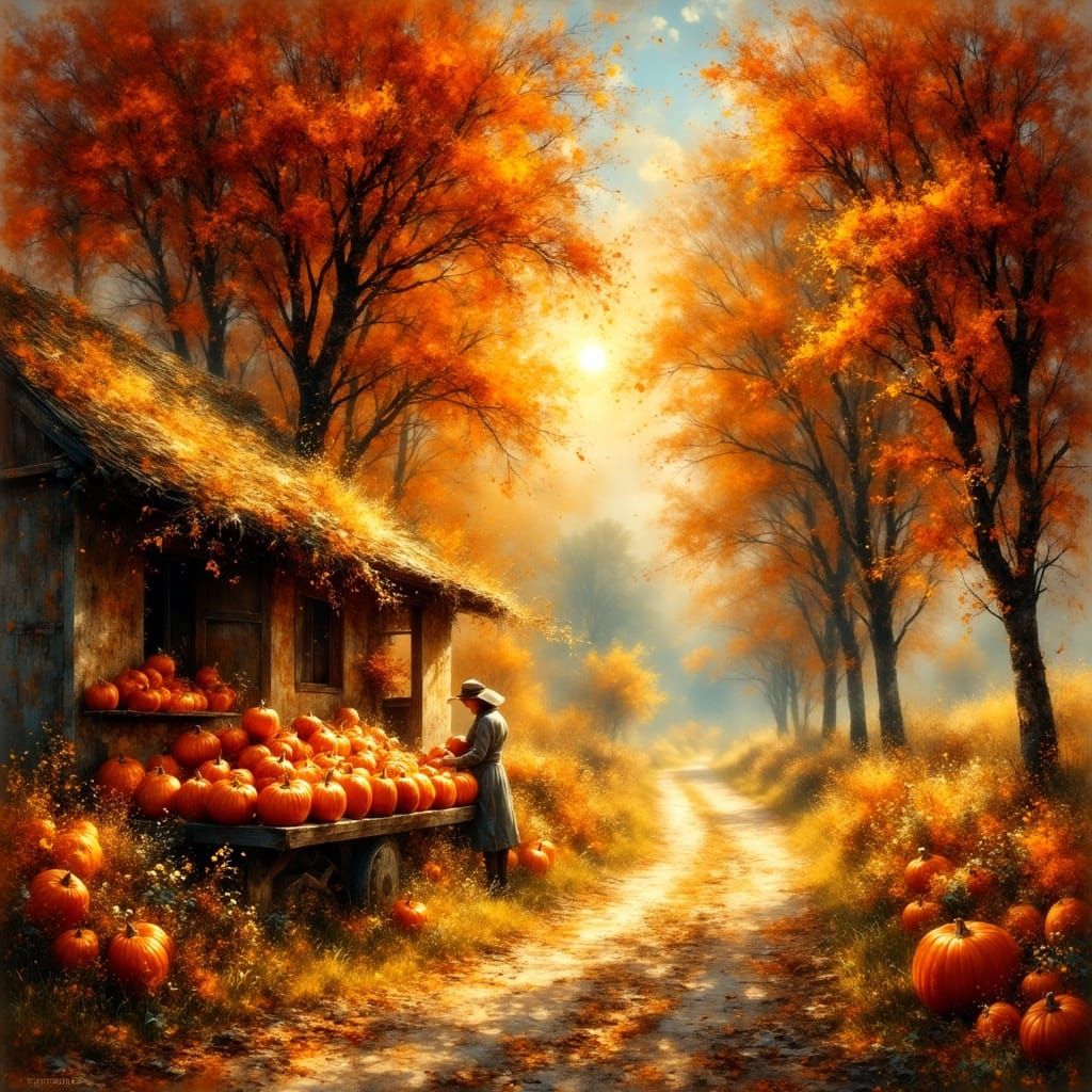 Generate unique autumn images with pumpkins, fallen leaves, and farmer's stalls. Start creating your own scenes for free!