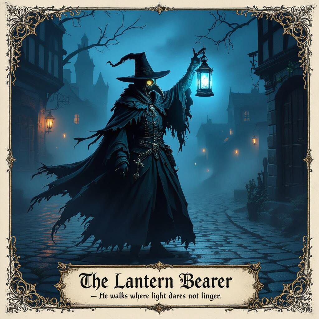 This dark fantasy collectible card depicts a plague doctor on a foggy cobblestone street at night, holding a glowing blue lantern. Rendered in a detailed matte painting style with cinematic shadows.