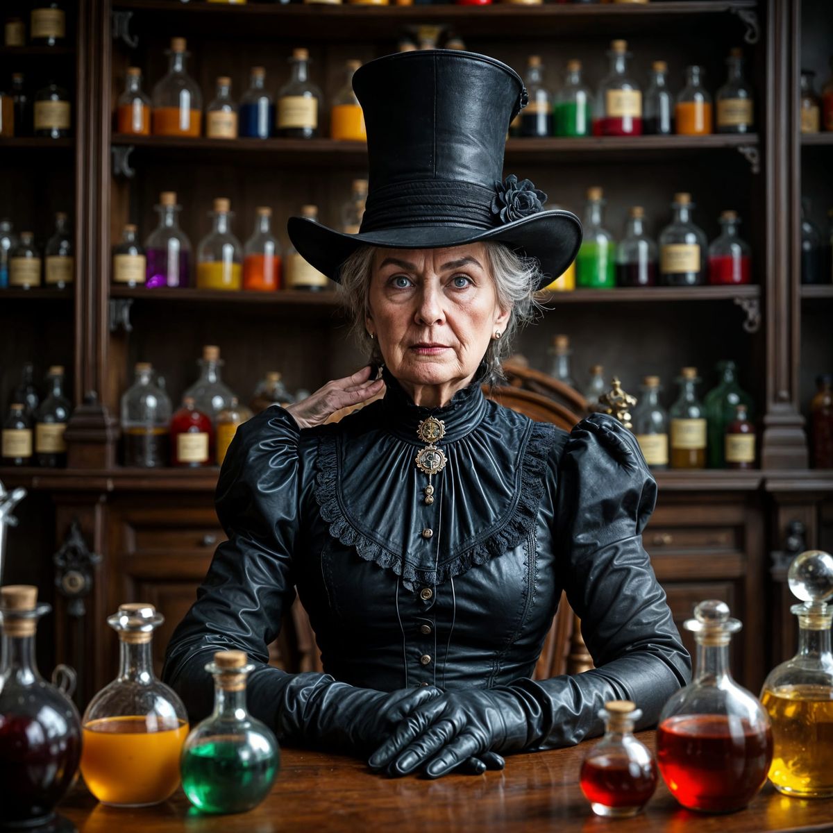 A proud, authoritarian figure in a Victorian gothic pharmacy, surrounded by colorful potion flasks. Detailed, sharp focus, low angle view.